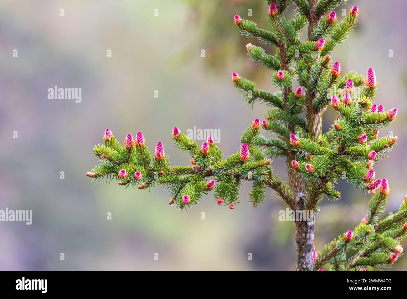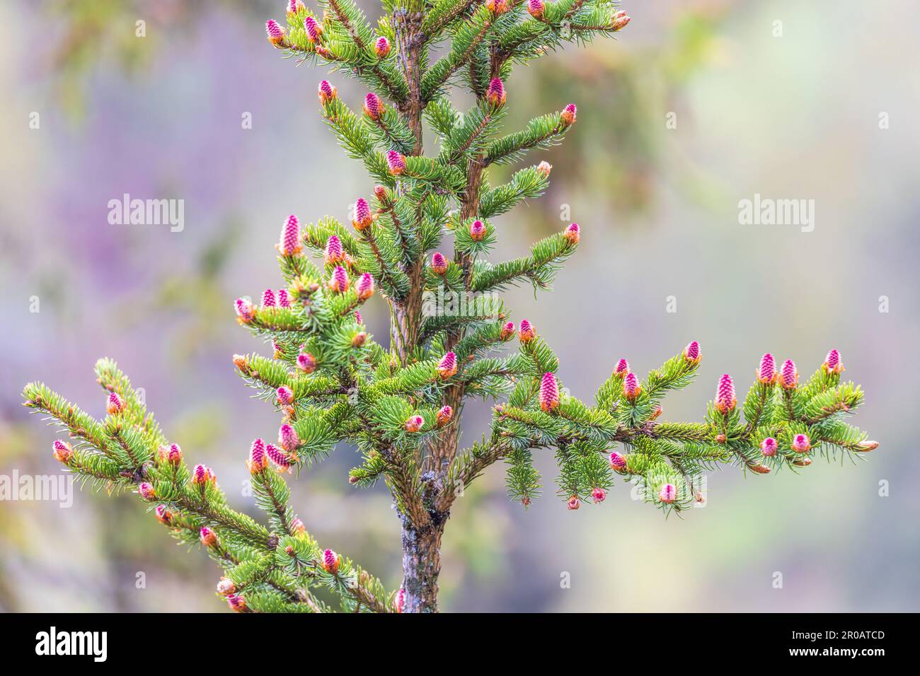 Spruce tree with new red cones in spring Stock Photo - Alamy