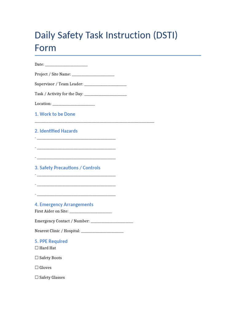 DSTI (Daily Safety Task Instruction) Tem | PDF | Occupational Safety ...