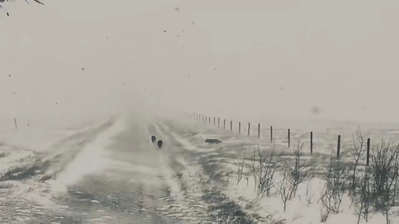Spring snowstorm blankets ranch as dogs play in Alberta, Canada