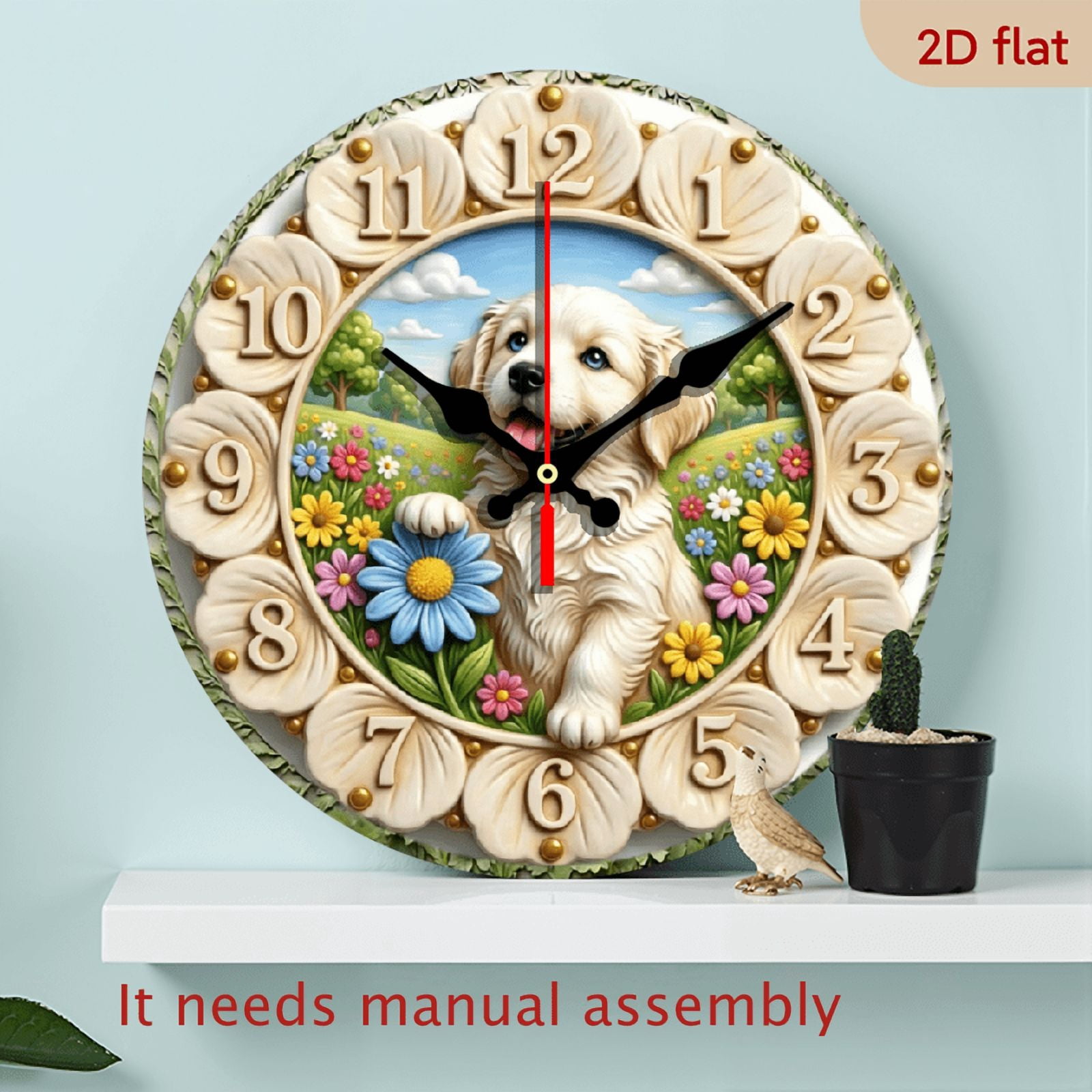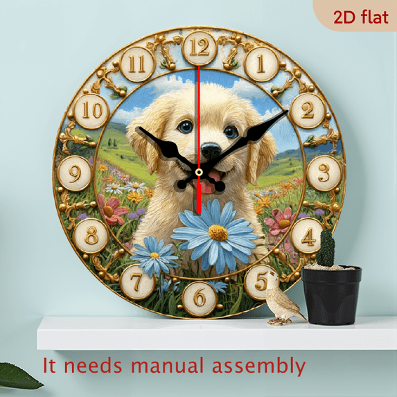 2D Flat 1pc 10Inch Wooden Wall Clock Beige Dog In Flower Garden With ...
