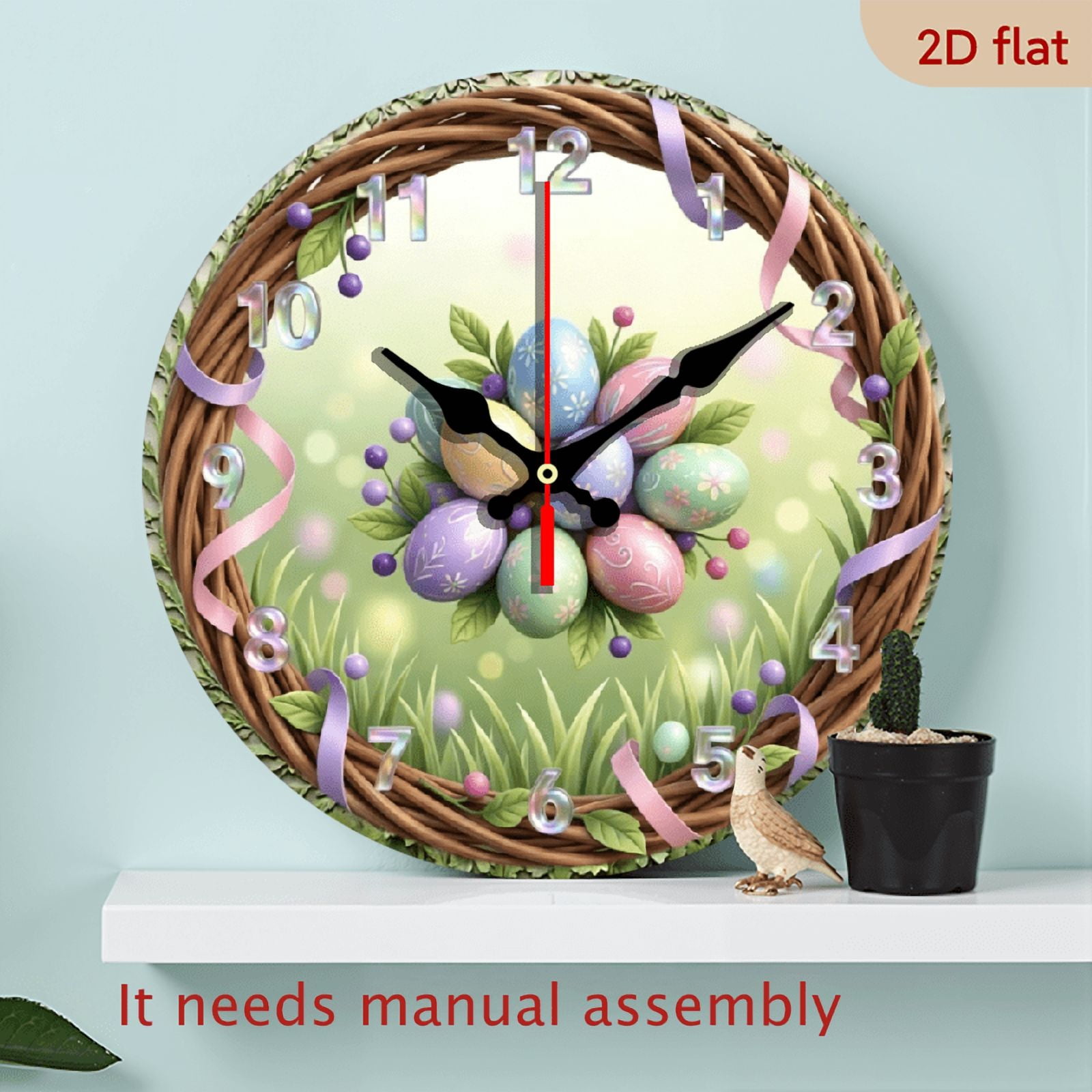 2D Flat10Inch Easter Egg Wreath Wooden Wall Clock Multicolor Decorative ...