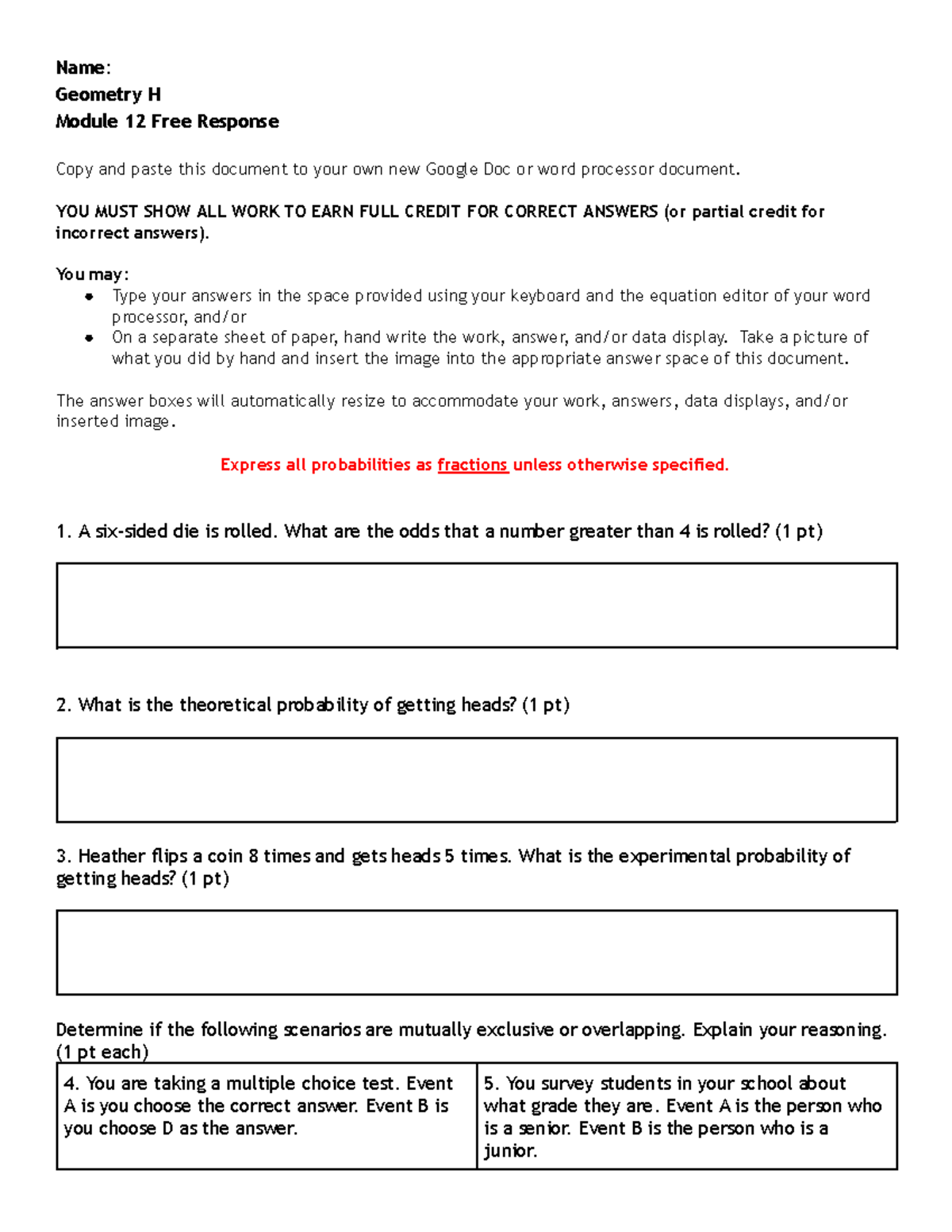 Geometry H M12 Free Response Spring 2023 - Name: Geometry H Module 12 ...