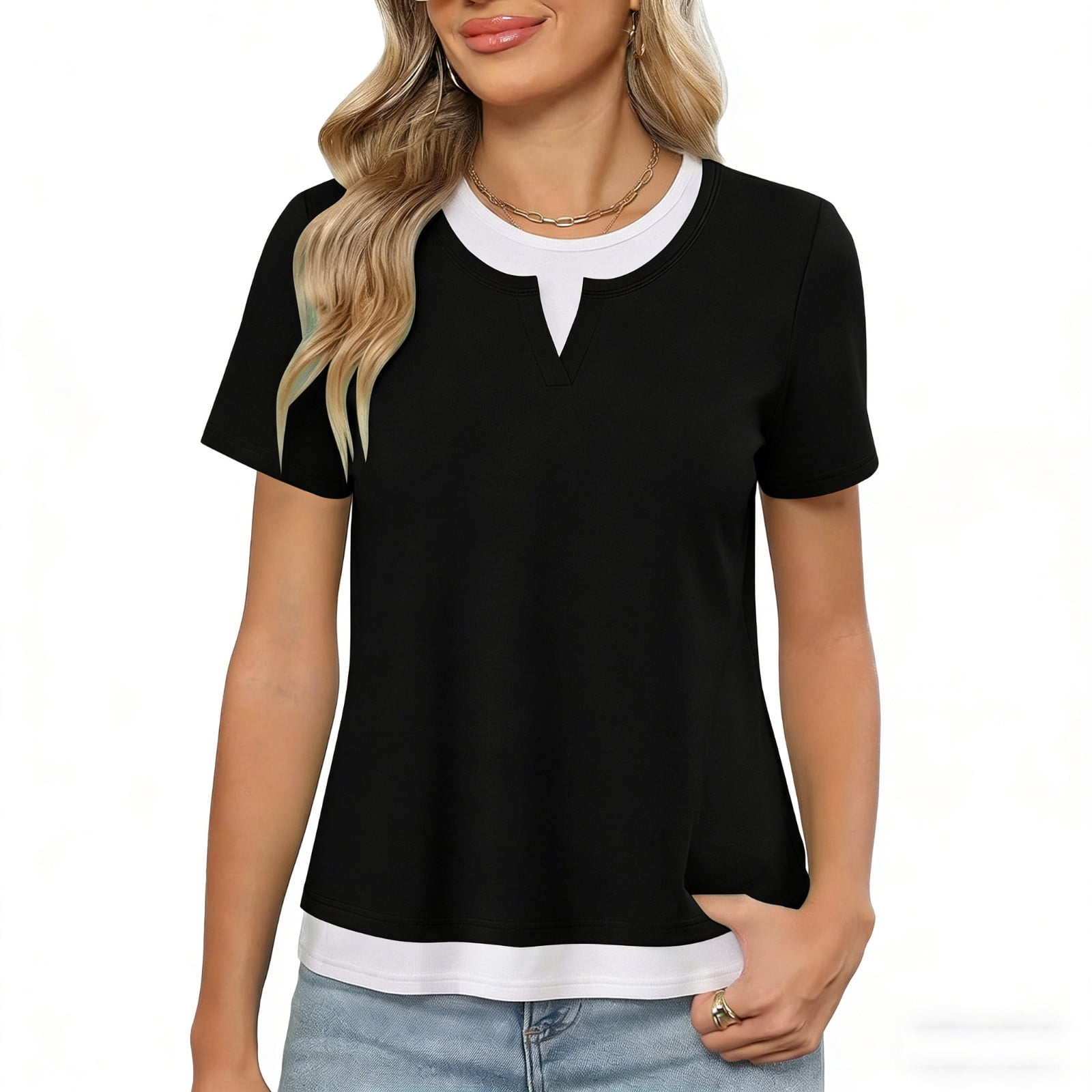 biudgviw Womens Summer Tops Color Block Patchwork Short Sleeve T Shirts ...