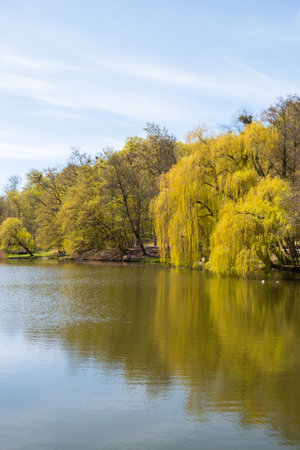 Trees reflection on the pond surface, spring park, lake 55048720 Stock ...
