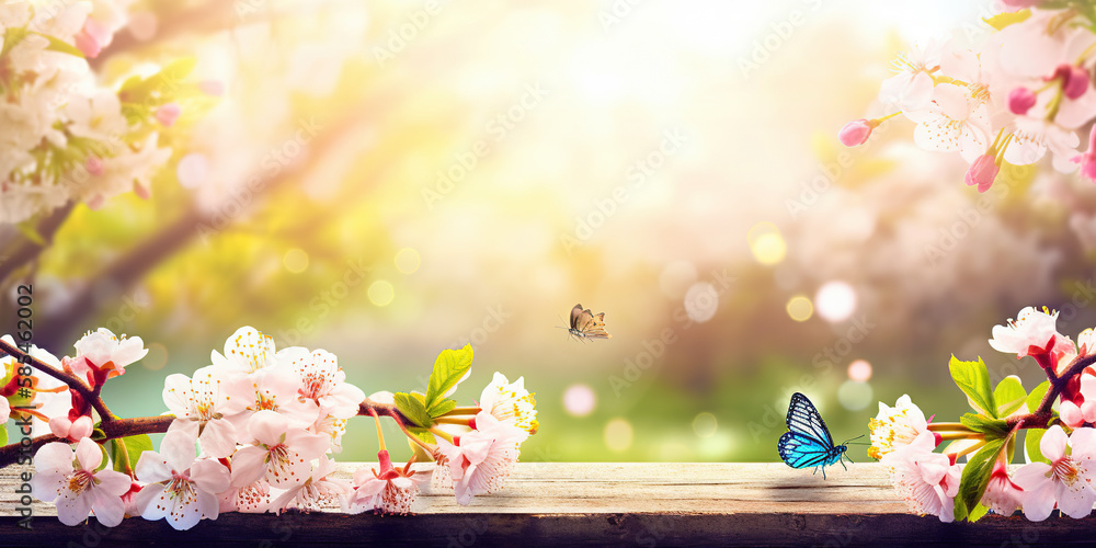 Fresh spring themed banner with floral decorations on the bottom and an ...