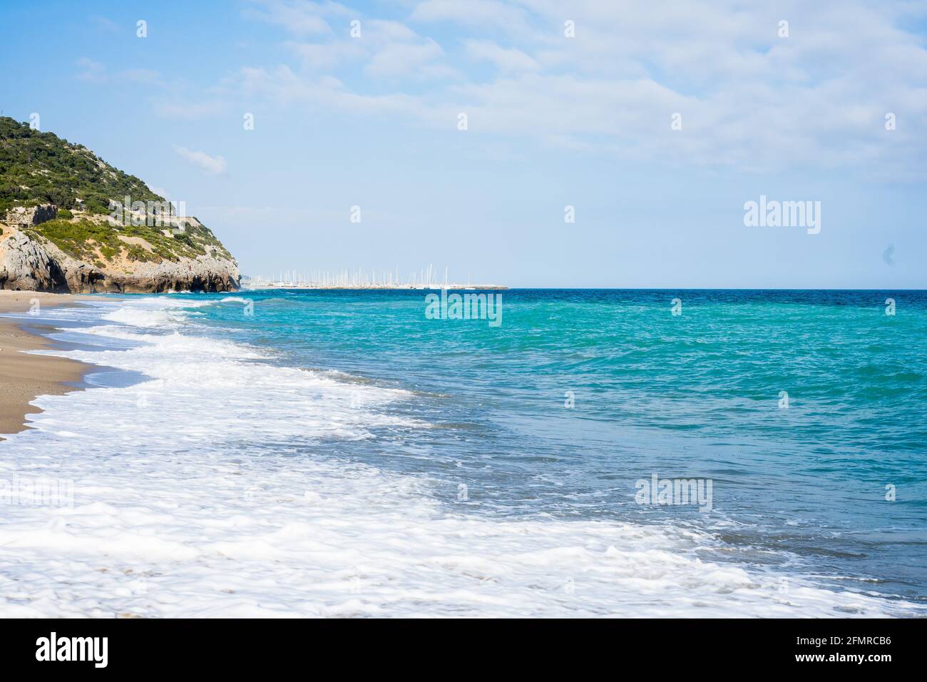 Empty Sea Beach In Spring With Some Birds And Cargo Ships On The ...