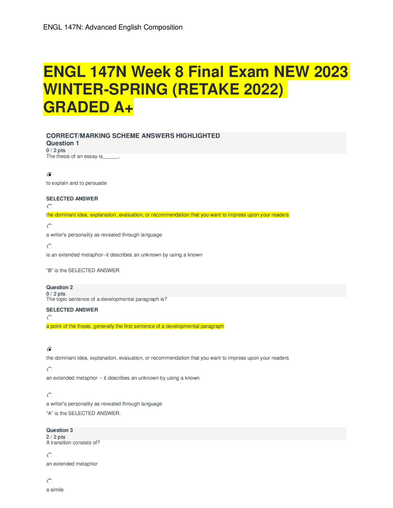 ENGL 147N Week 8 Final Exam NEW 2023 WINTER-SPRING (RETAKE 2022) GRADED ...