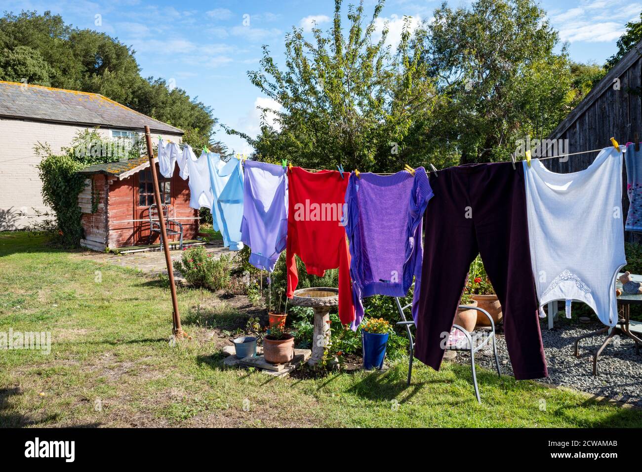 Washing line with clothes drying in a garden Stock Photo - Alamy