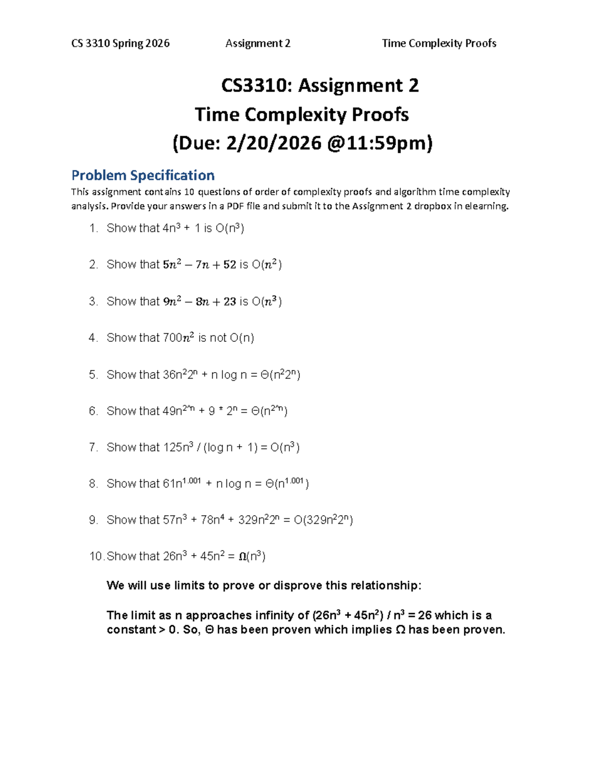 CS 3310 Spring 2026 Assignment 2: Time Complexity Proofs - Studocu
