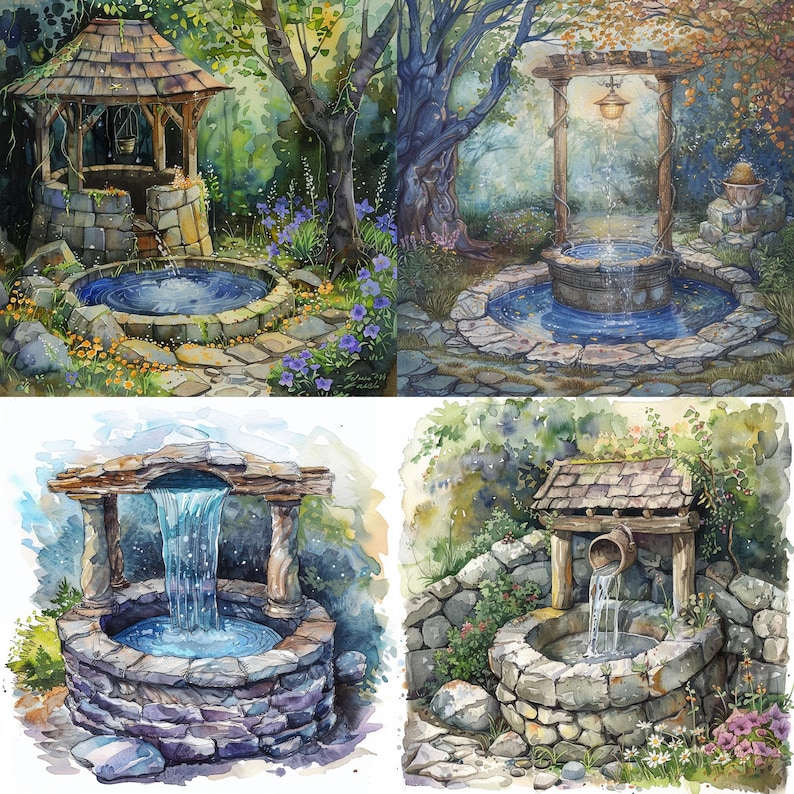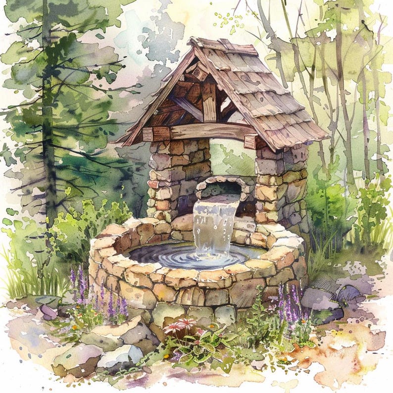 24 Hand Drawn Garden Well Clipart Digital Download, Watercolor Stone ...