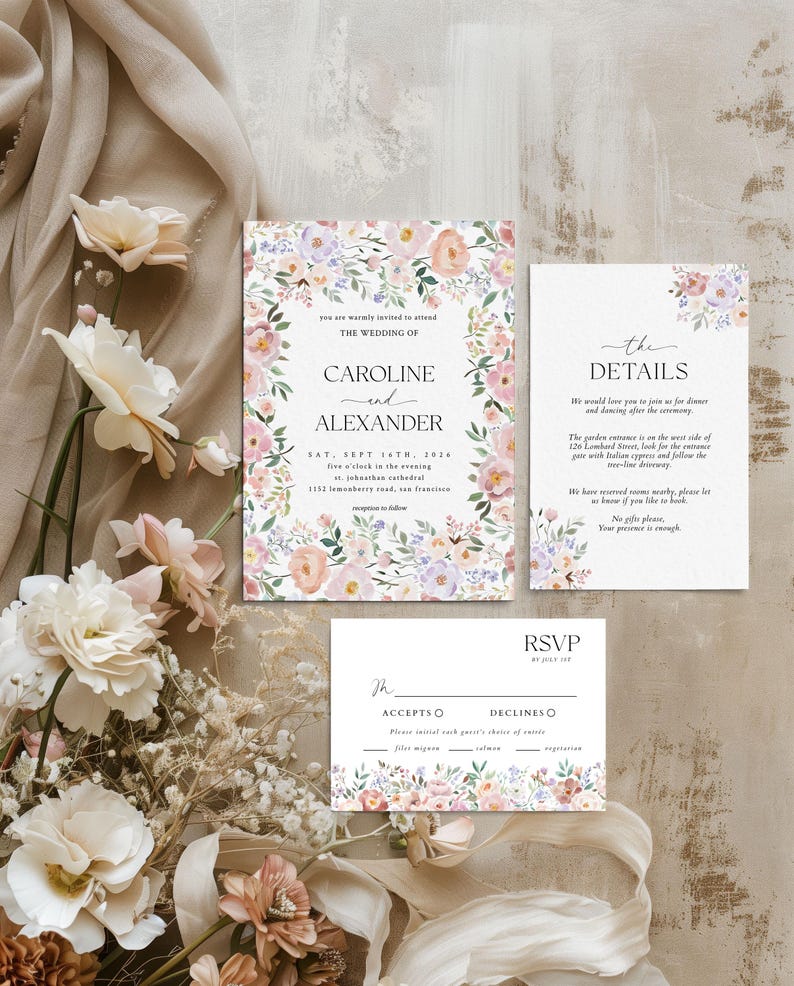 Spring Floral Wedding Invitation Set, Watercolor Pastel Flowers ...