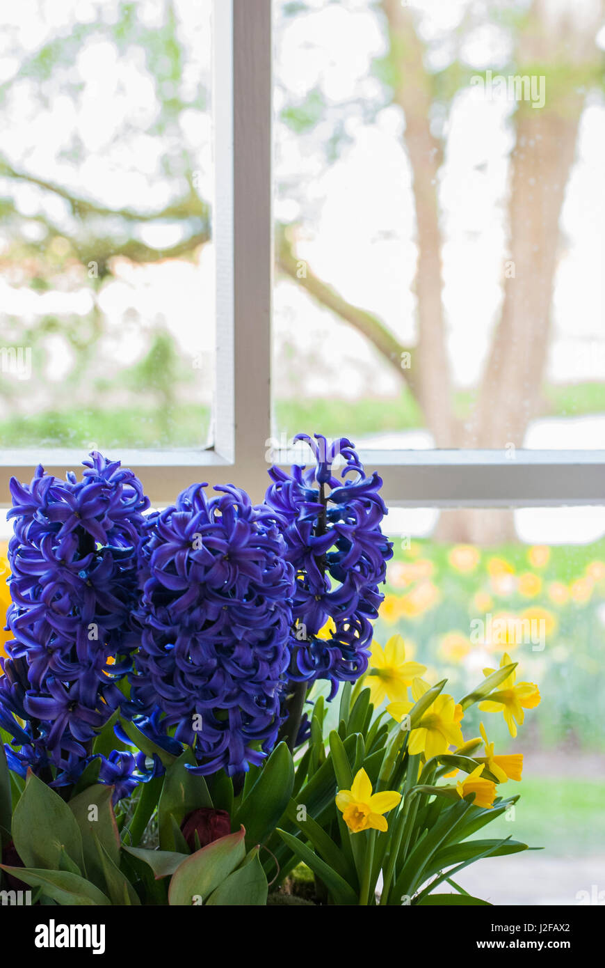 Different beautiful spring flowers on window sill Stock Photo - Alamy