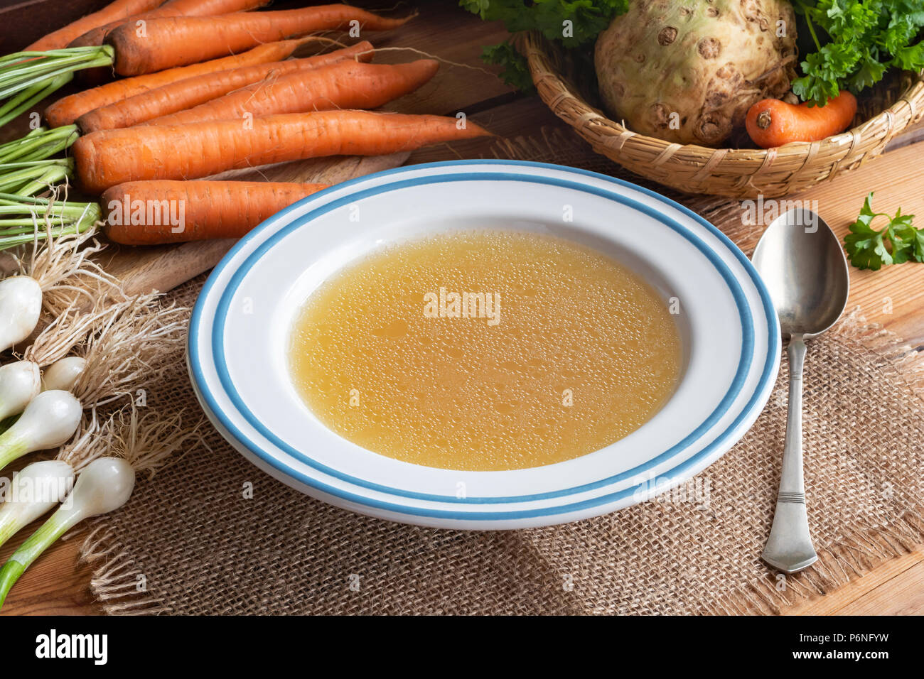 Chicken bone broth with vegetables on a table Stock Photo - Alamy