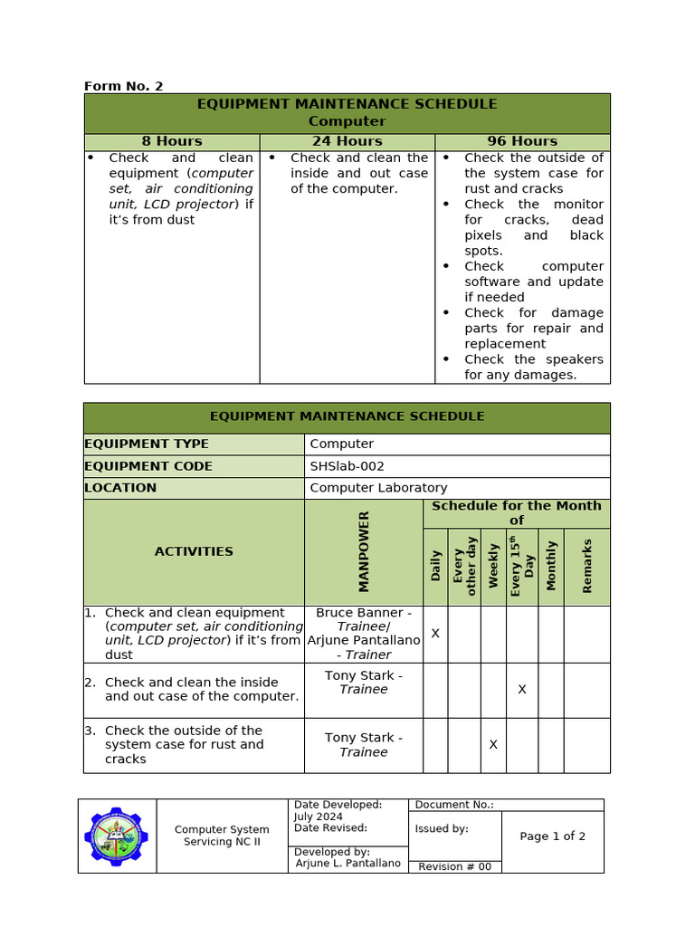 Form 2 - Equipment Maintenance Schedule_ALPantallano | PDF