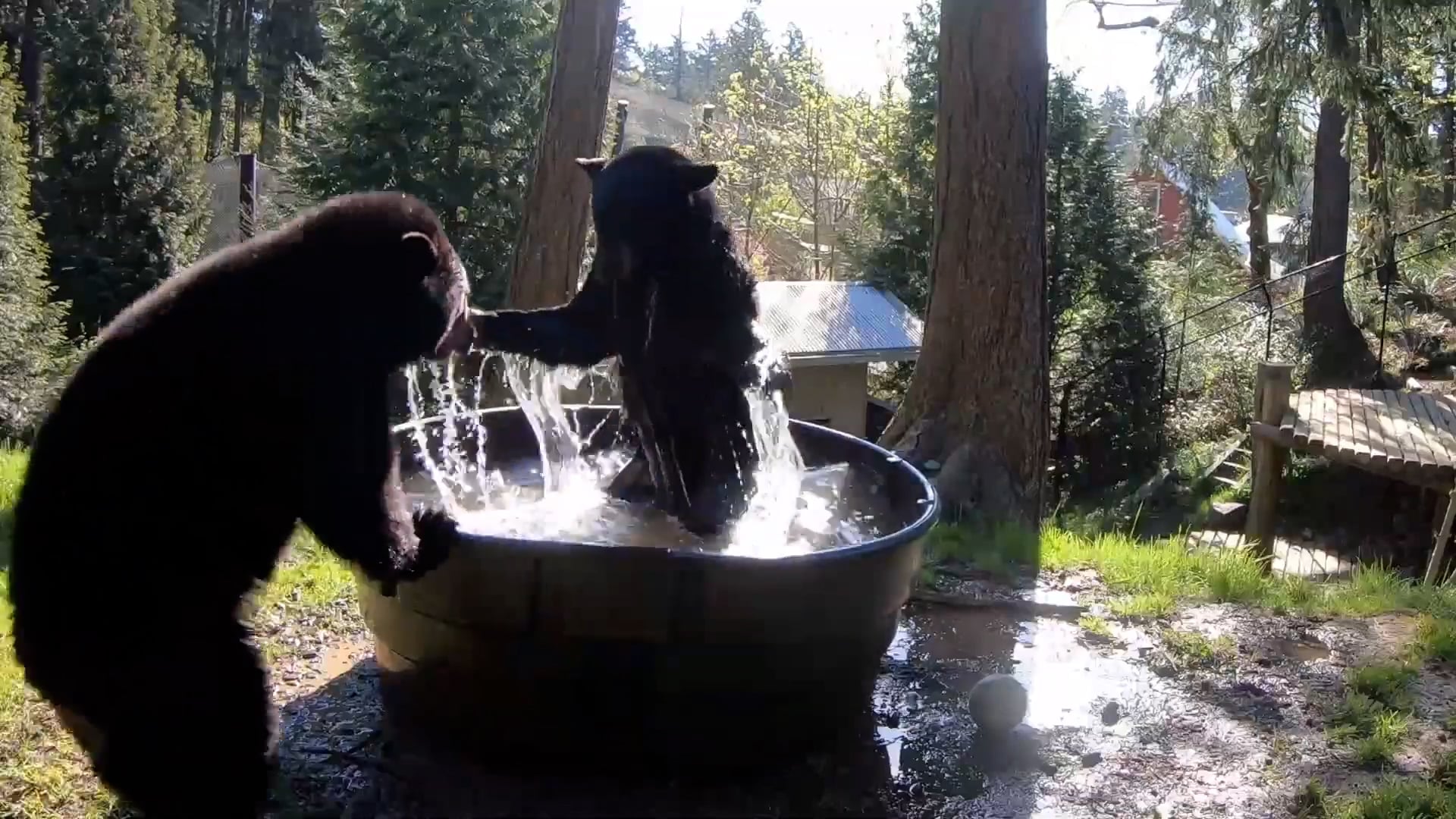 Playful moment rescued black bears cool off with springtime splash