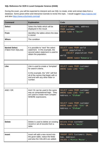 SQL Reference for OCR A Level Computer Science (H446) | Teaching Resources