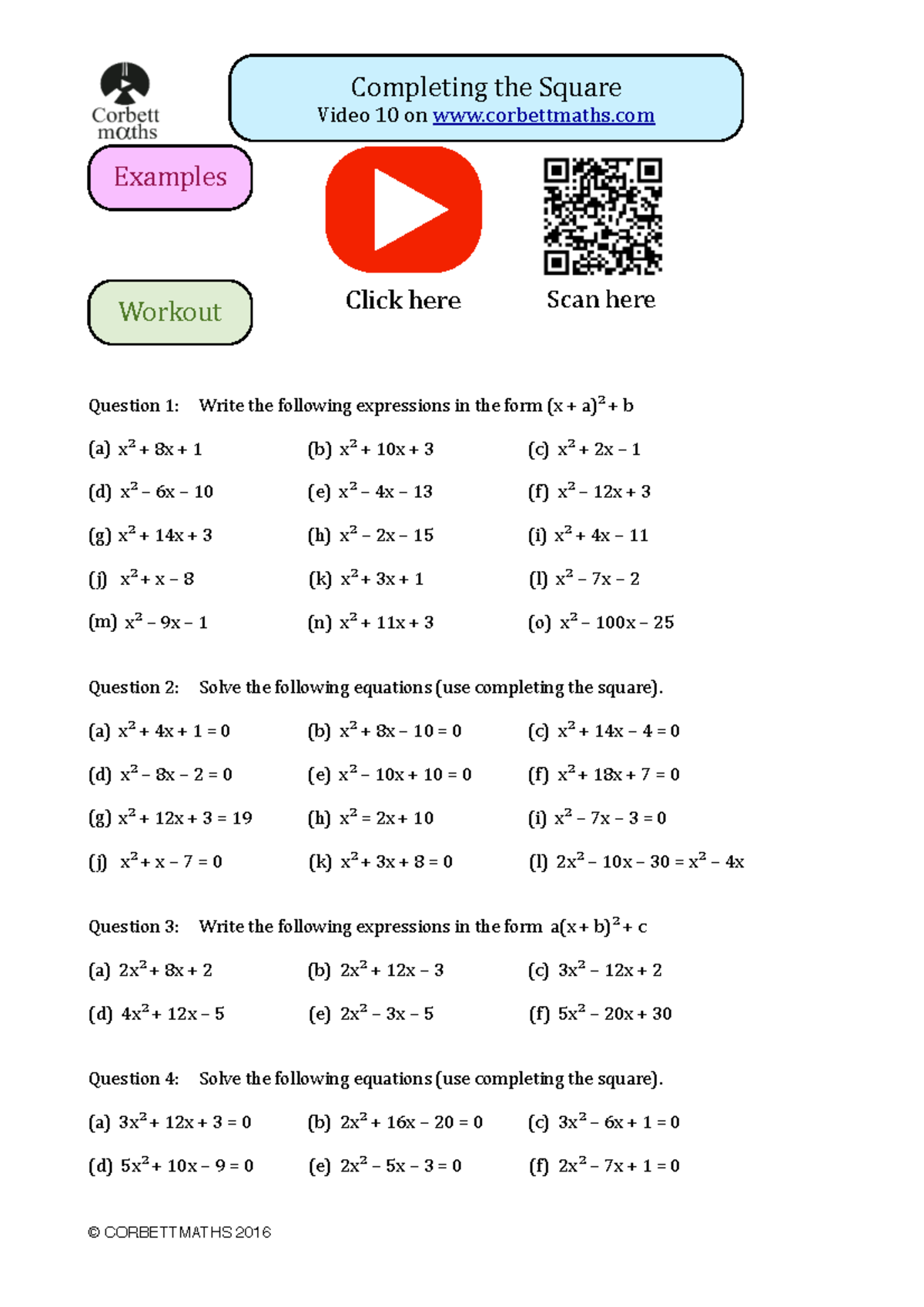 Completing the Square Textbook Exercise - Corbettmaths - Worksheets Library