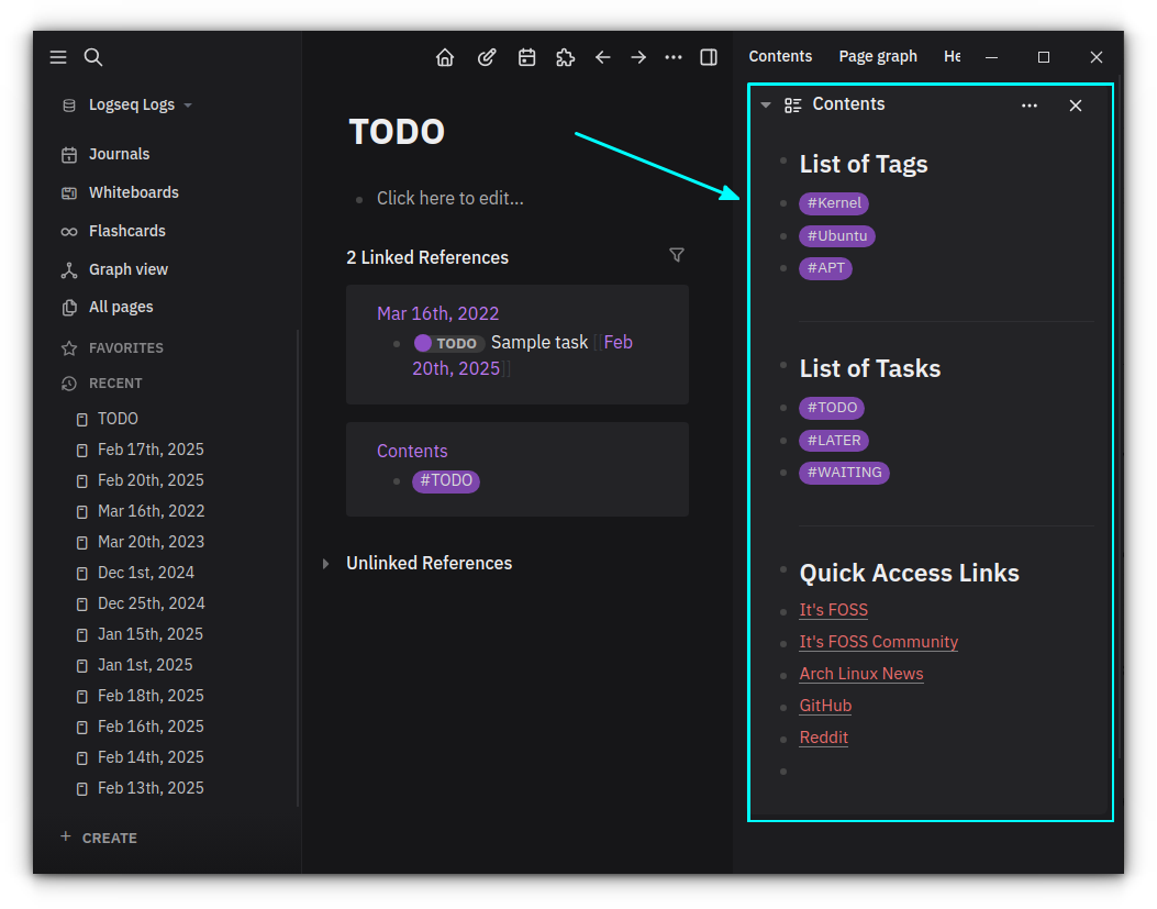 Journals and Contents: Two Special Pages in Logseq