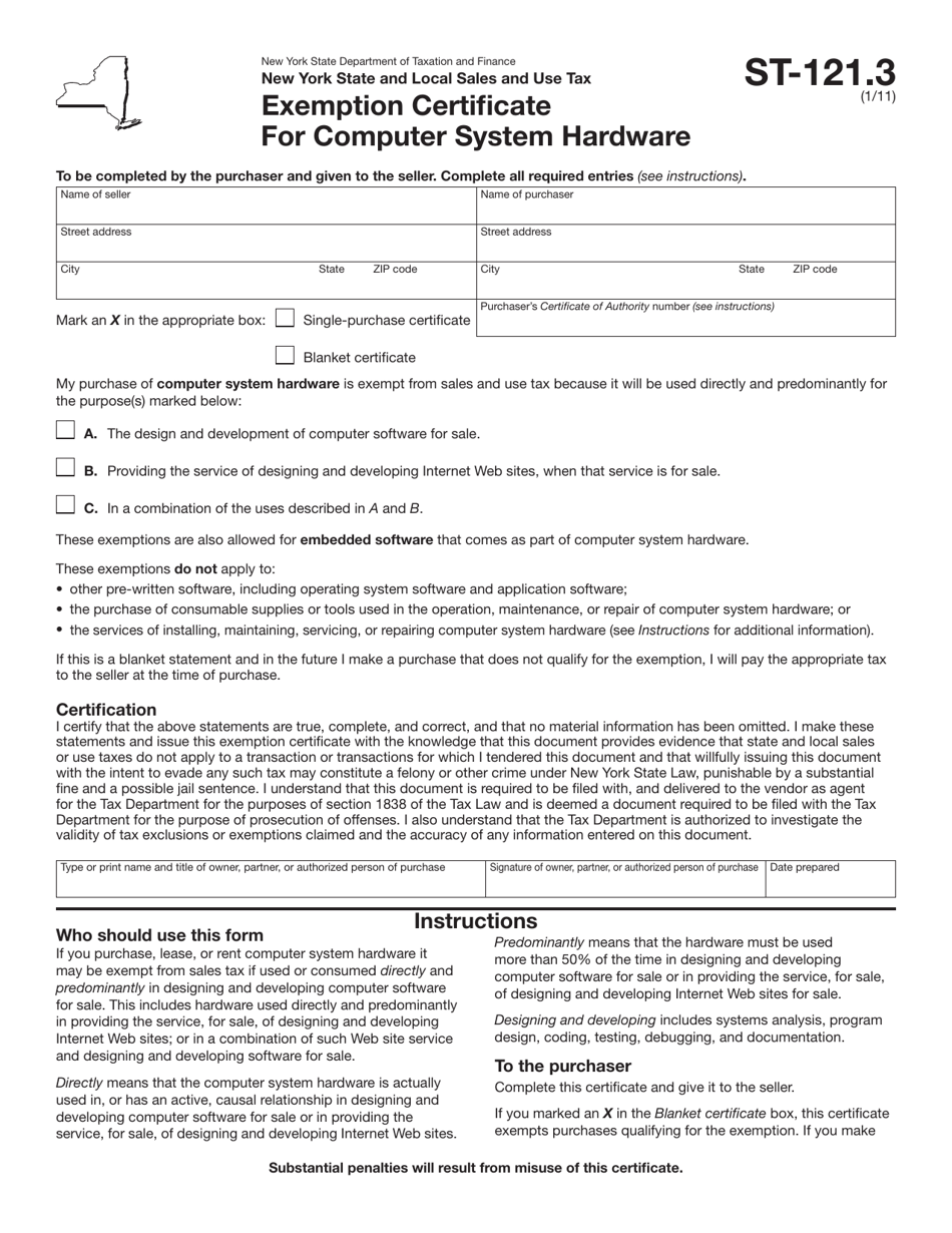Fillable Online Exempt Use Certificate (Form ST-121) - Tax.NY.gov Fax ...