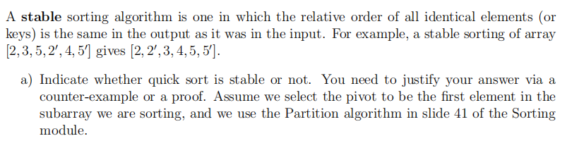 Is quicksort a stable sorting algorithm? If yes, prove it, if not, give ...