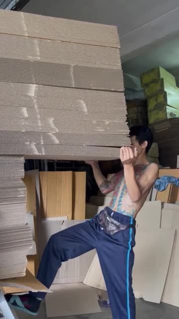 Strong worker carries huge stack of cardboard sheets on his head