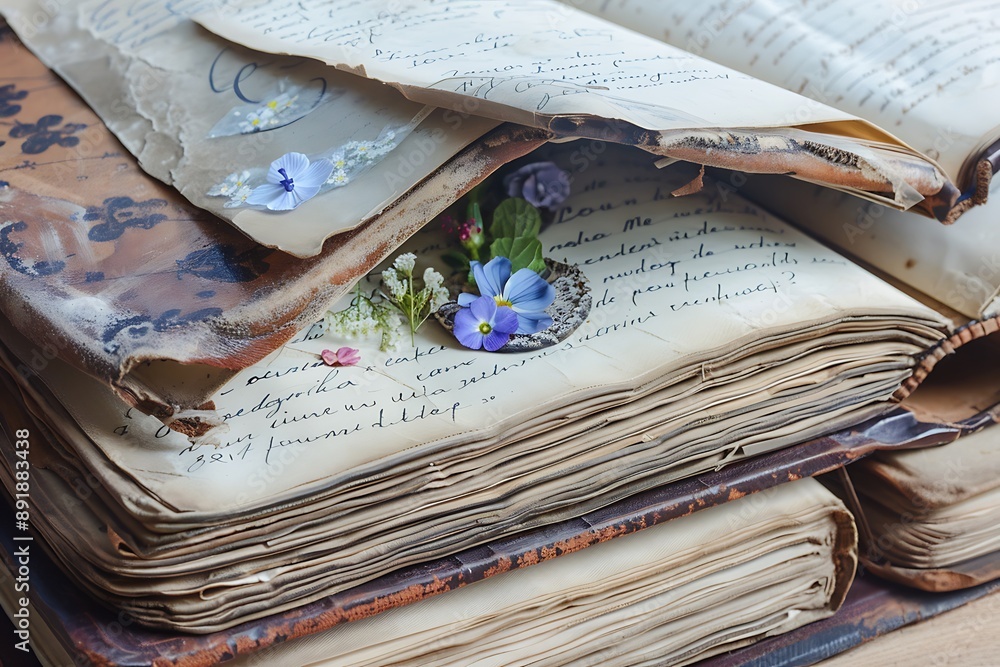 Old handwritten pages stacked on rustic wooden table evoke nostalgia ...