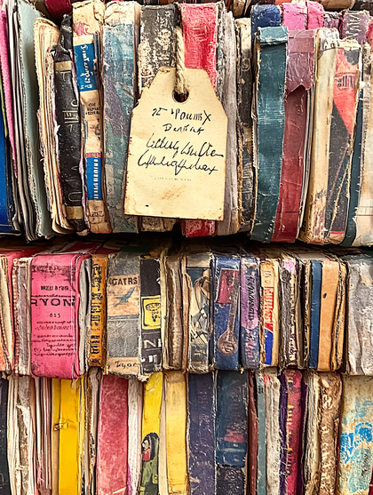 A towering stack of aged, worn notebooks filled with faded handwritten ...