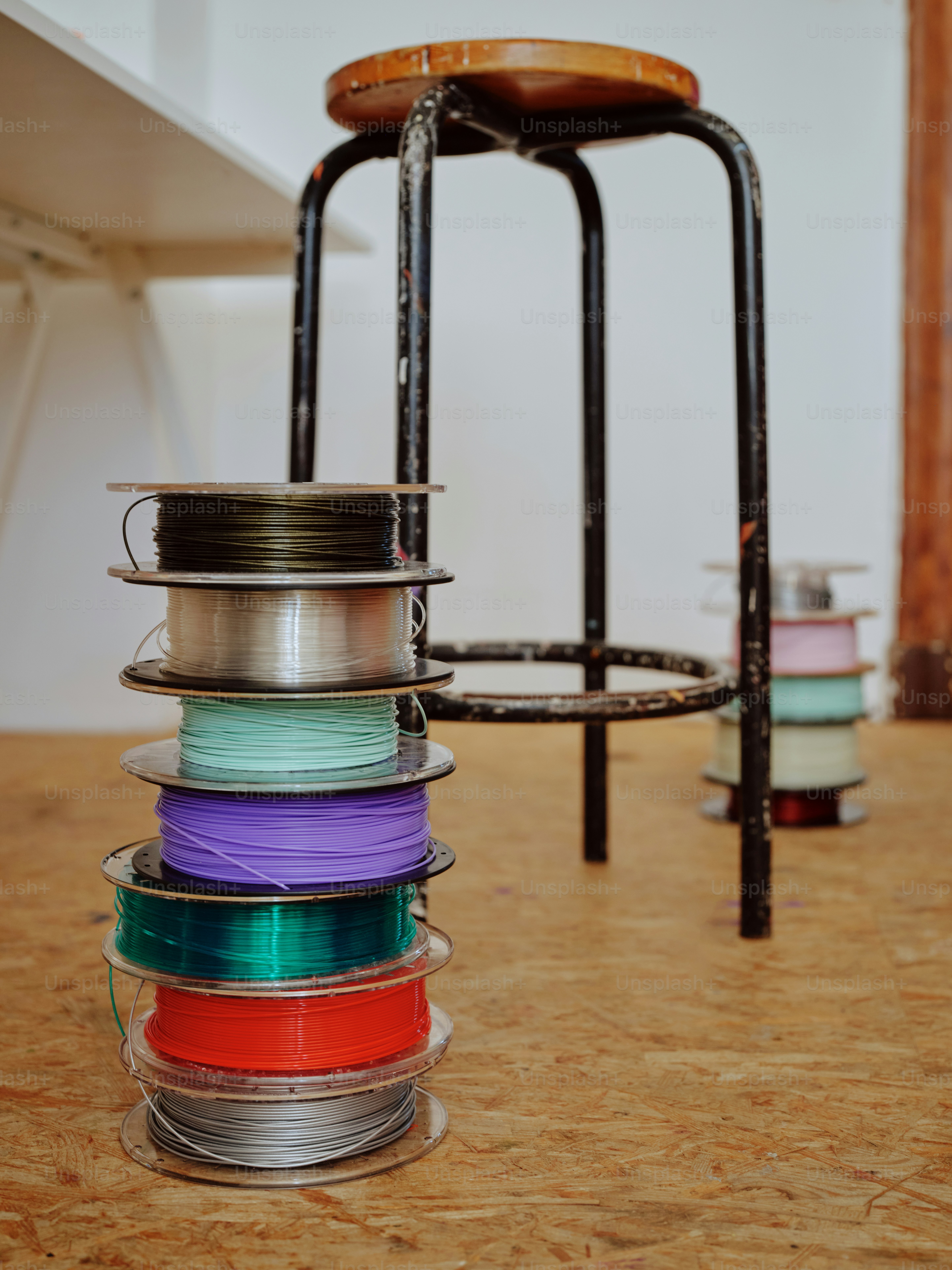 A stack of spools of wire sitting on top of a wooden table photo – 3d ...