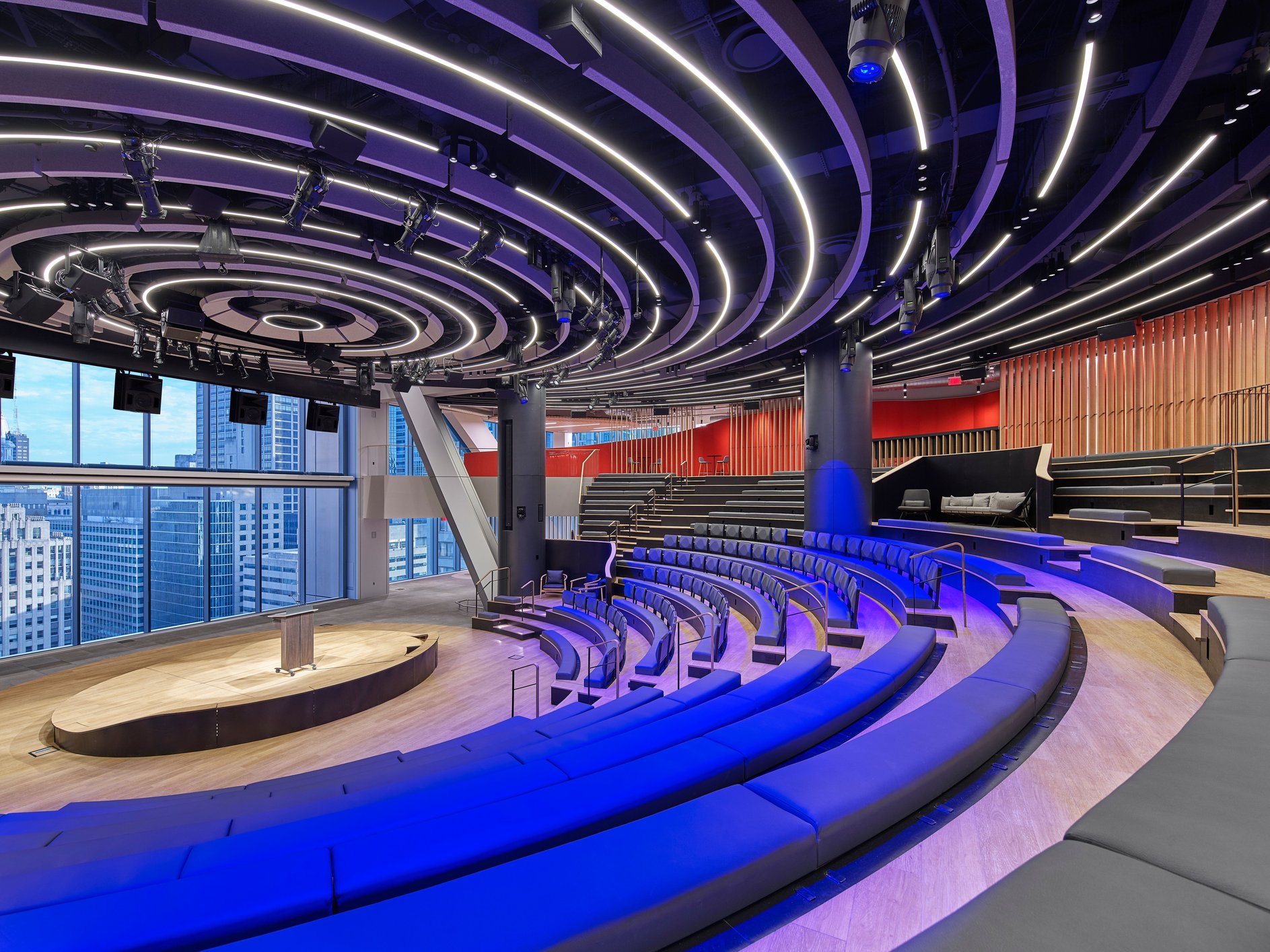 Modern Wooden Auditorium with Tiered Seating and Ambient Lighting for ...