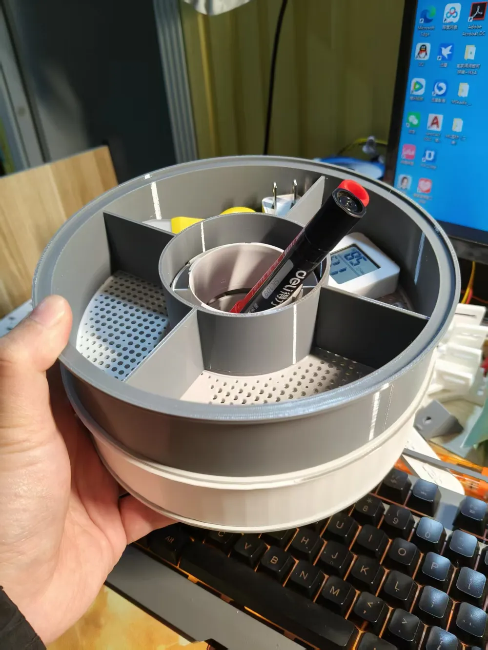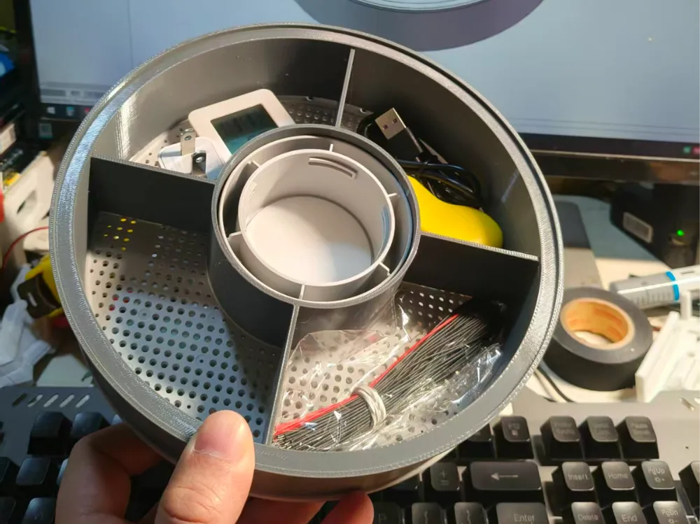 Repurposed filament spool storage drawers, spiral structure, rotatable ...