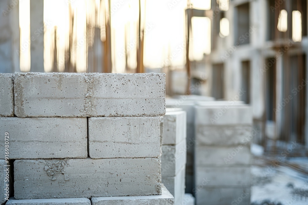 Stacked Concrete Blocks at a Construction Site with Blurred Background ...