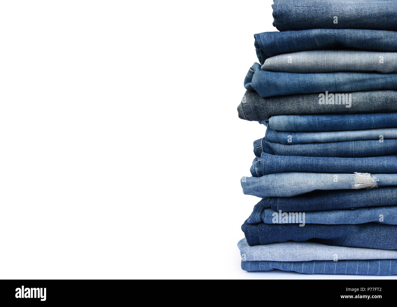 Stack of blue jeans on white Stock Photo - Alamy