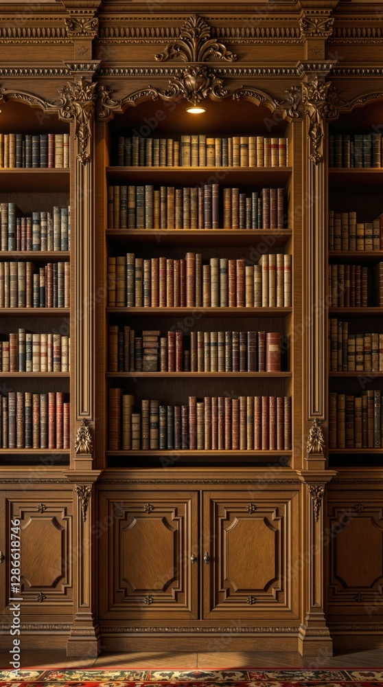 Ornate Wooden Bookcase Filled With Books In A Library Room Background ...