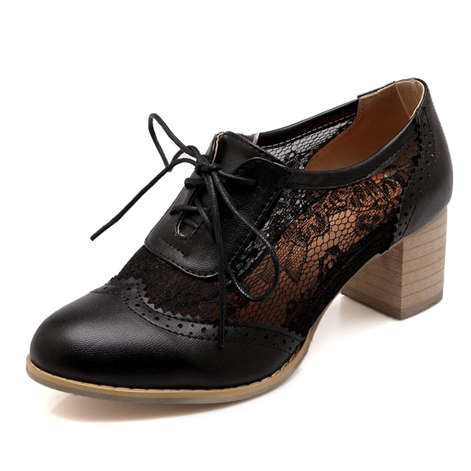 Yunkctuk Womens Lace Mesh Stacked Chunky Heel Wingtip Oxfords Round Toe ...