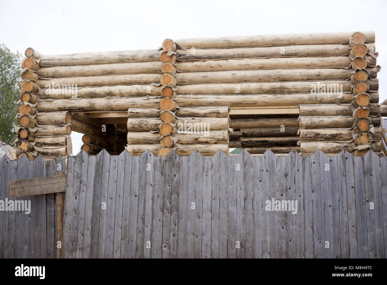 Close-up of stacked logs forming the outside corner walls on an old ...