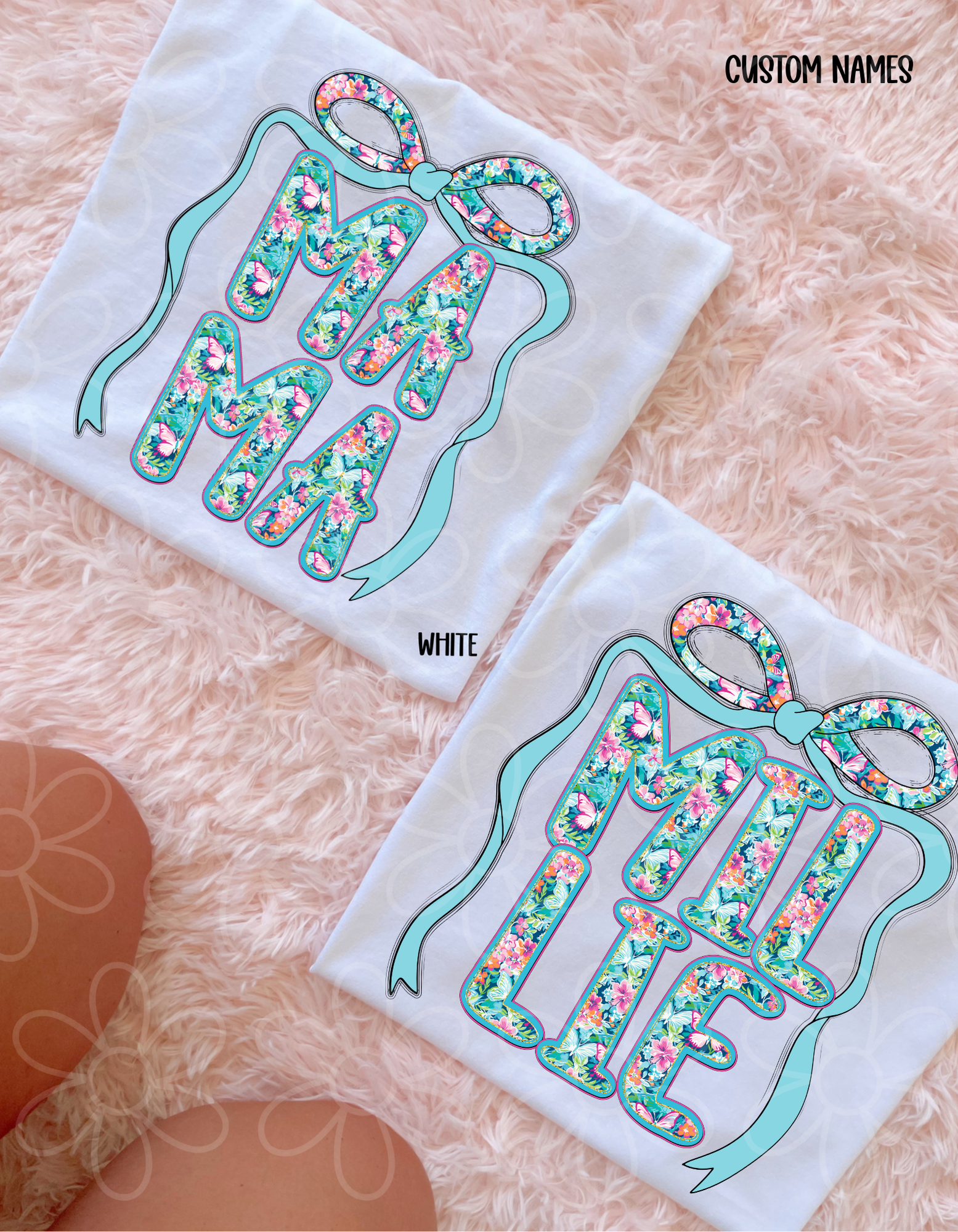 Floral Blue Bow Stacked Custom Names Completed Tee – The Wholesale Shack
