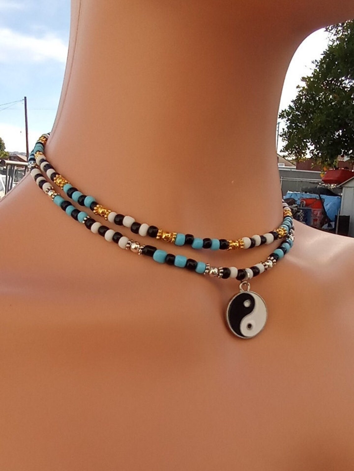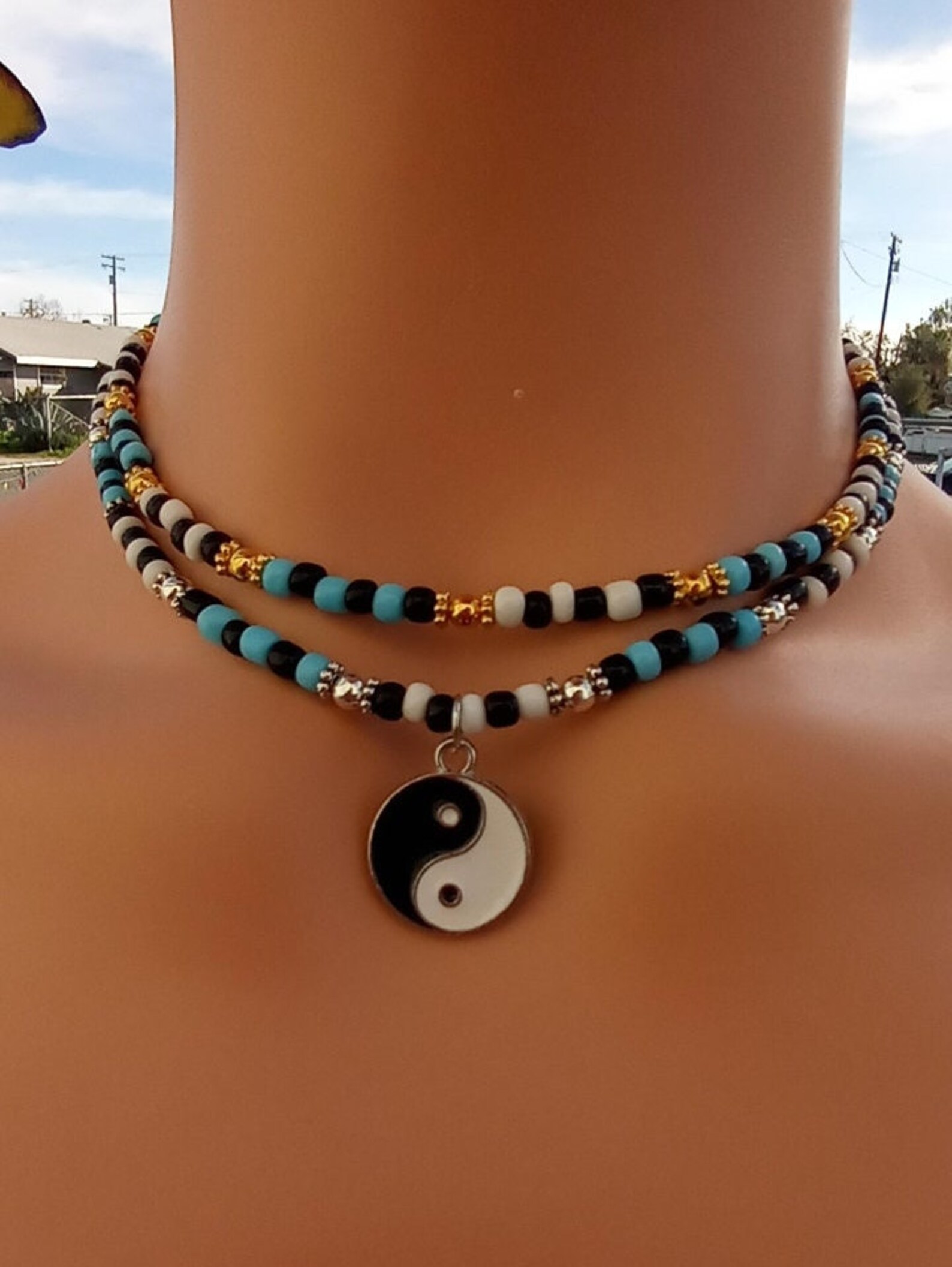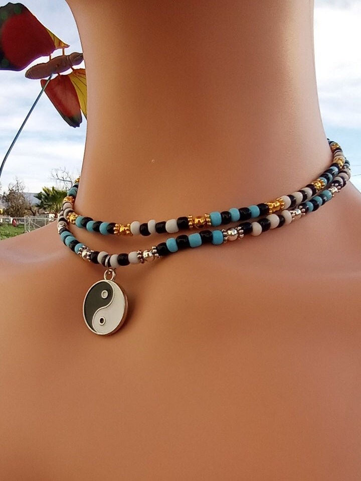 Y2K Yin Yang Layered Choker Necklace Blue and White Glass Sead Bead Yin ...