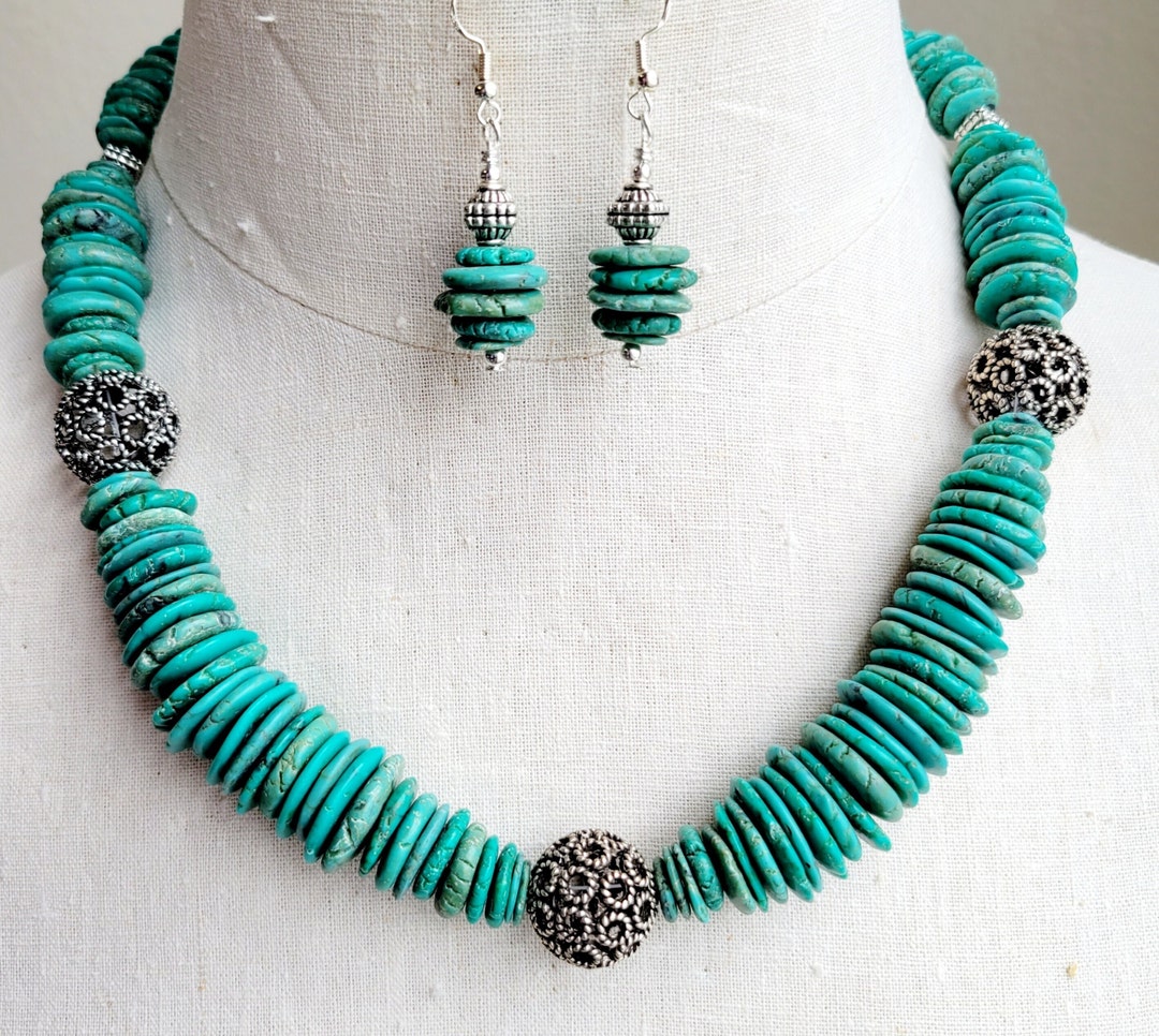 Blue Mexican Turquoise Stone Stacked Disc and Nugget Statement Necklace ...