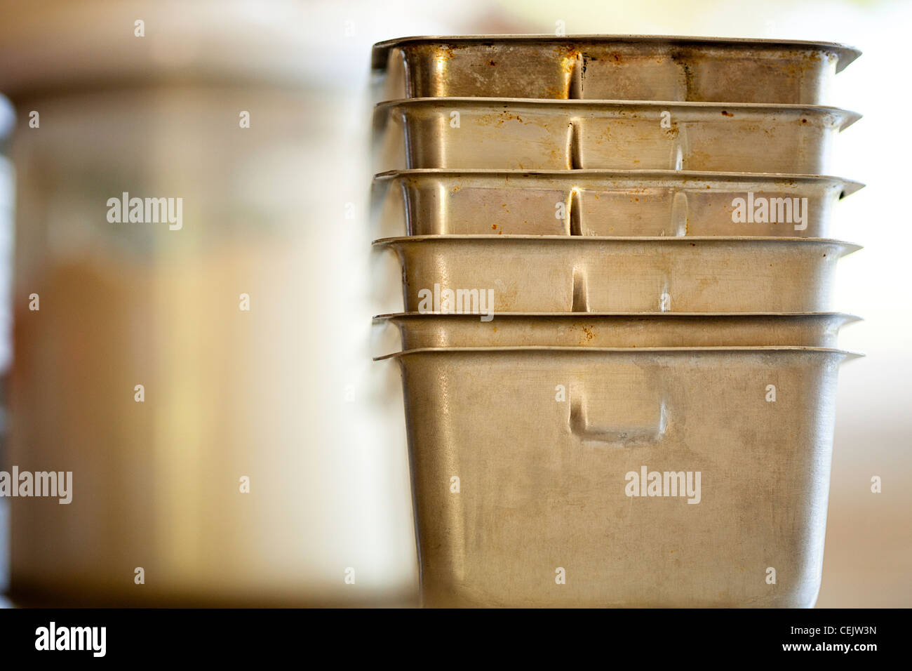 Stacked metal pans for use in the kitchen Stock Photo - Alamy