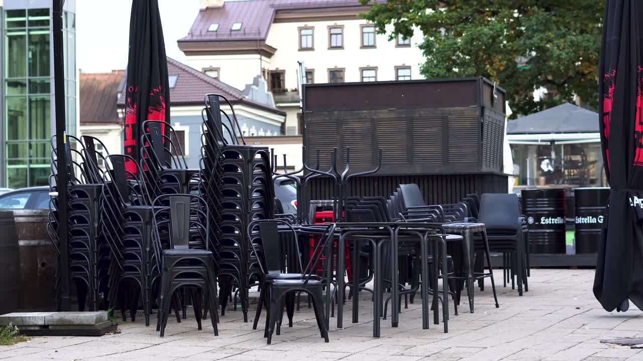 Stacked chairs of a closed outdoor restaurant Stock Photo - Alamy