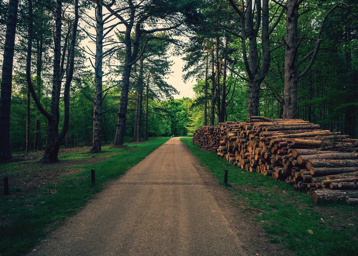 'Forest Road with Stacked Logs' Poster, picture, metal print, paint by ...