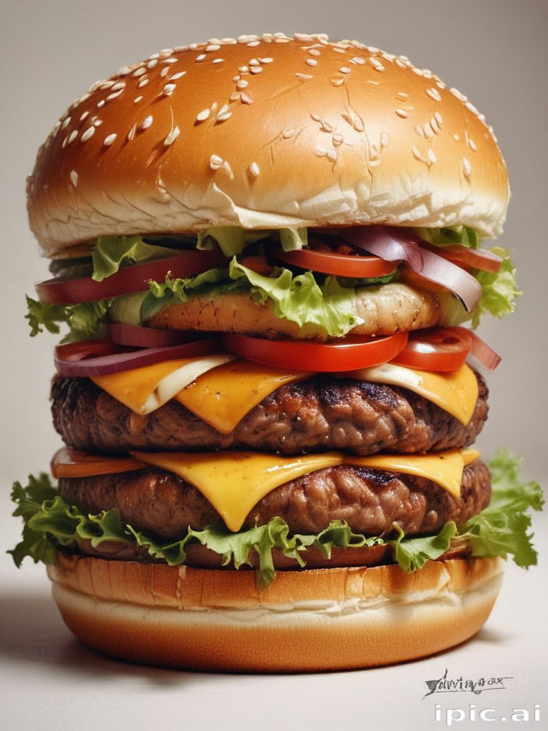 Deliciously Stacked Gourmet Burger with Fresh Vegetables and Cheesy Layers