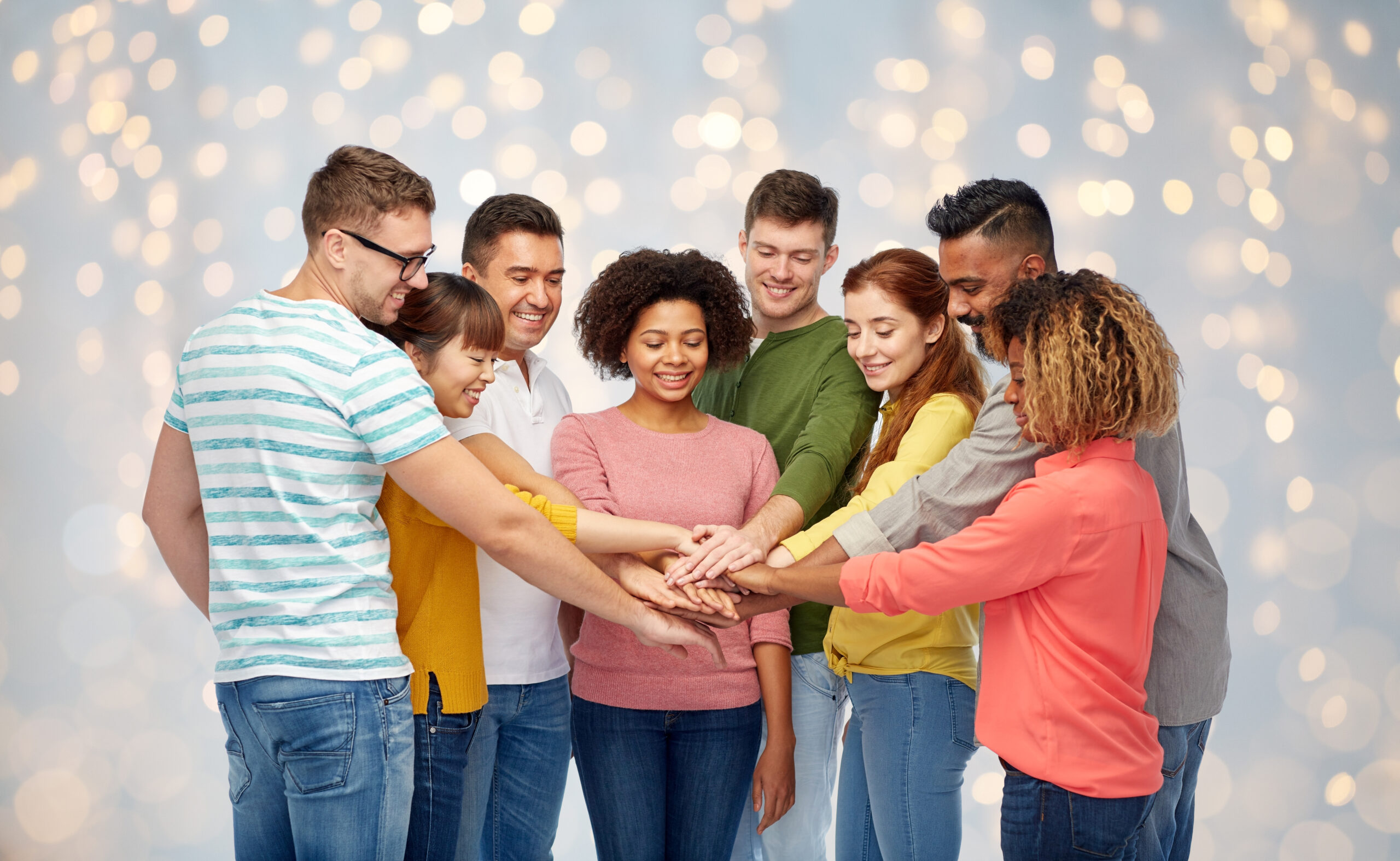 group of workers team unity mix people multiracial join hand together ...