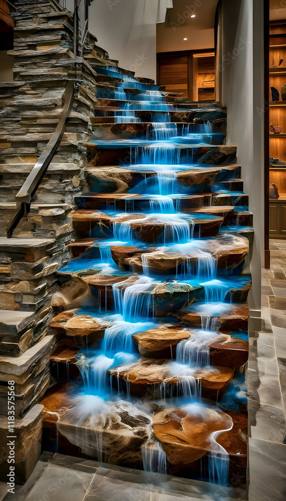 Stone staircase with cascading water feature creating a natural and ...