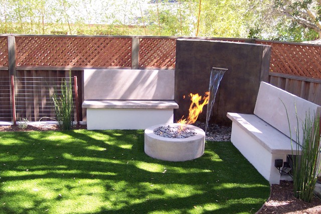 Very modern firepit with concrete seating and stained water feature ...