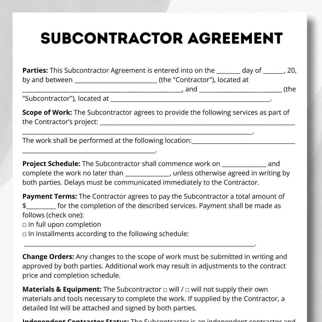 Subcontract Template, Subcontractor Forms, Subcontracting Contract ...