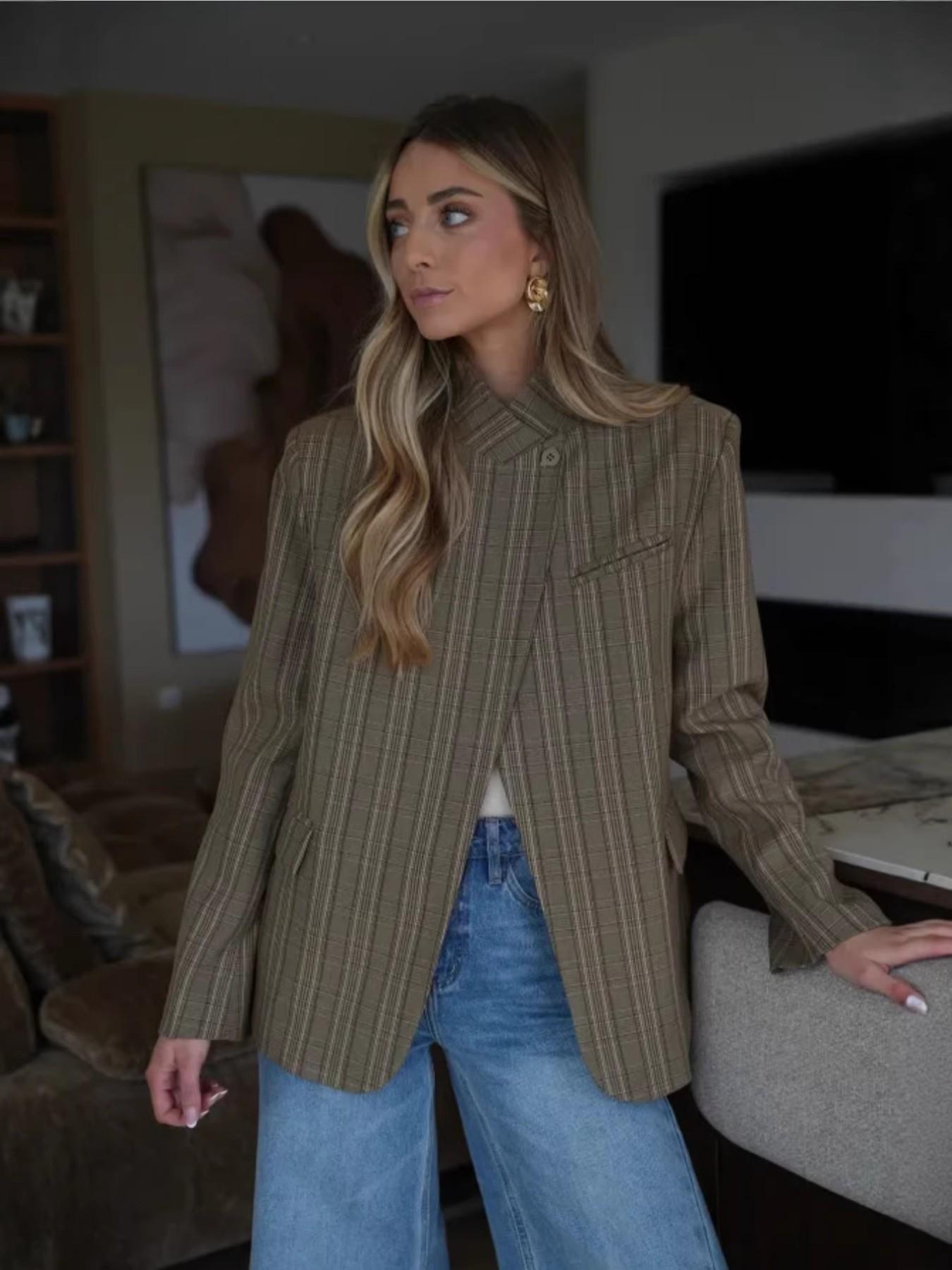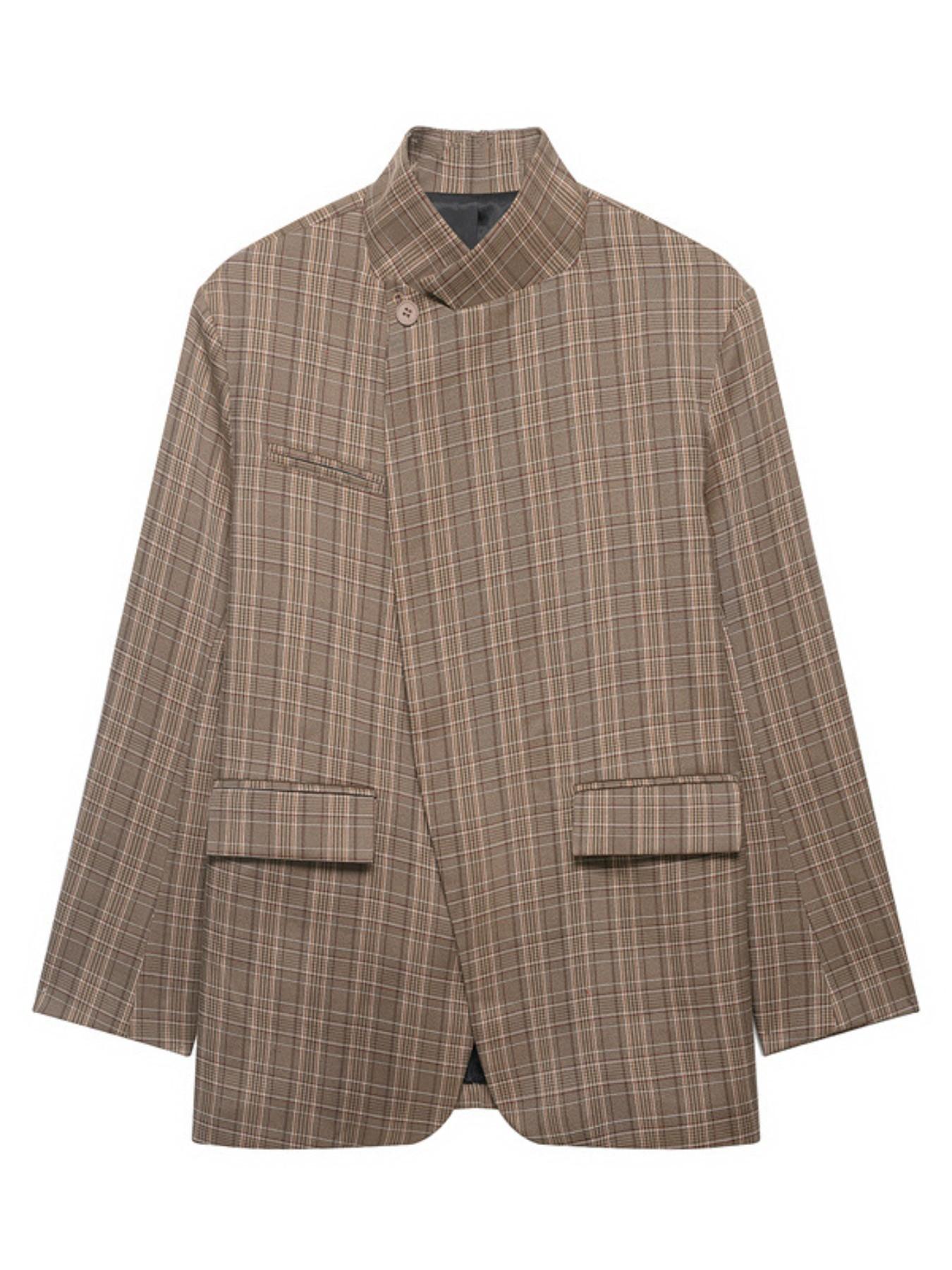 Women's Irregular Plaid Print Commuter Stand Collar Long Sleeve Single ...