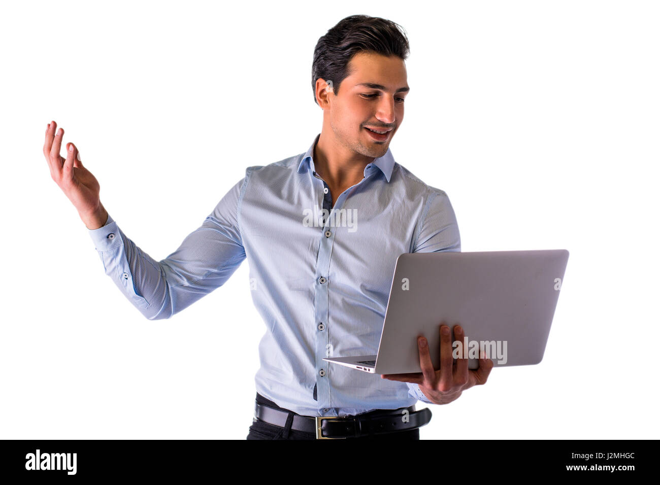 Studio portrait of young man standing holding laptop and looking at ...