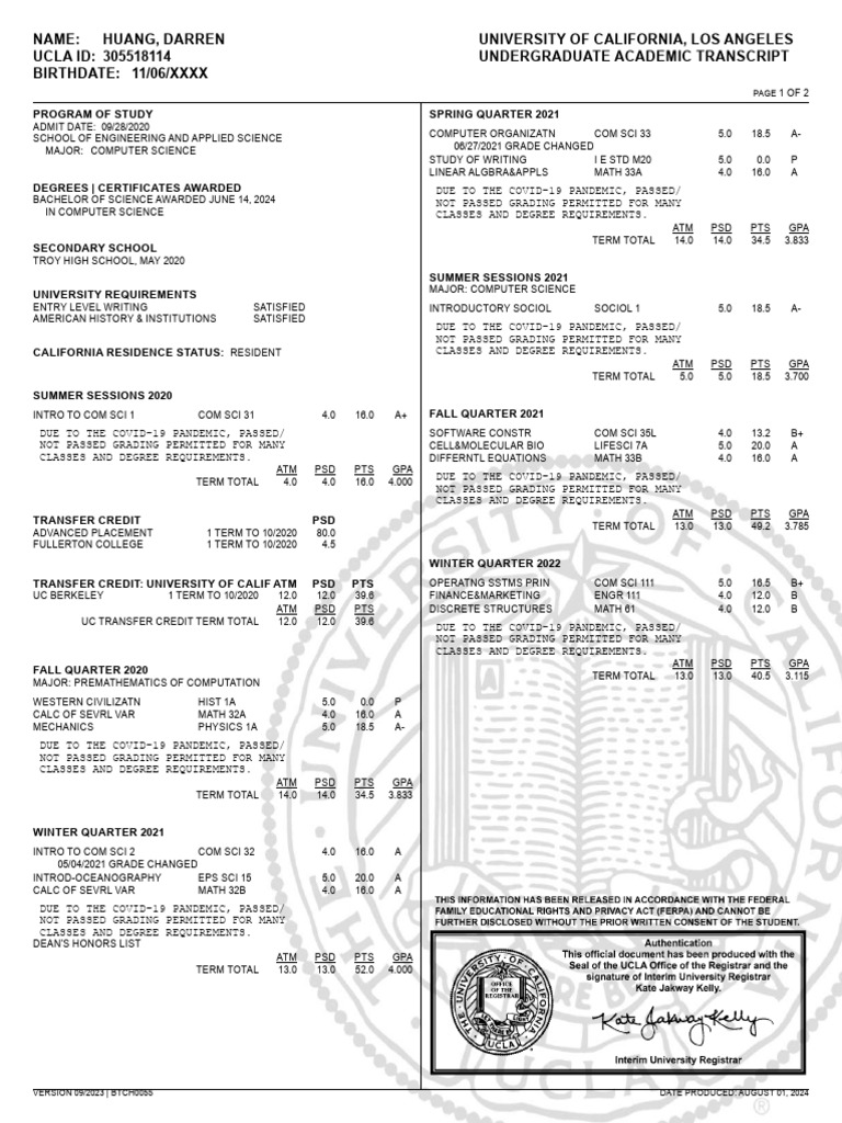 UCLA Computer Science Transcript 2024 | PDF | Academia