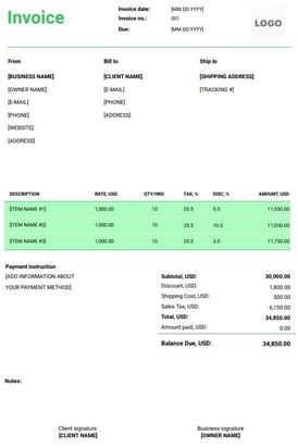 Editable Invoice Template Free Download word, excel, google docs and sheets